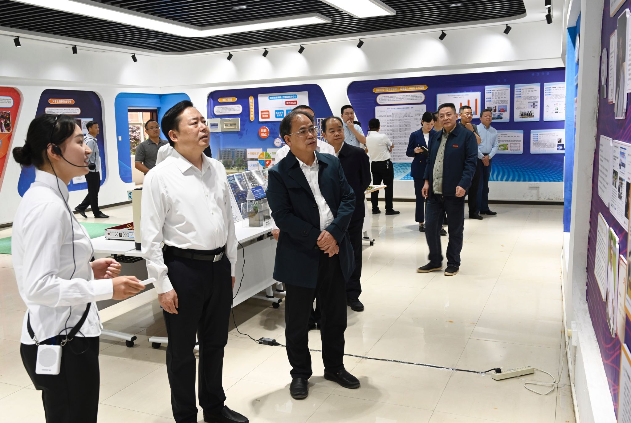 熊炜一行首先来到我校大学生创客中心,参观了创新创业展厅、路演厅、团队工作室和项目咨询室,察看师生创新创业成果展示,充分肯定了我校学子在科技创新方面展现出的专业素养和创造才能。