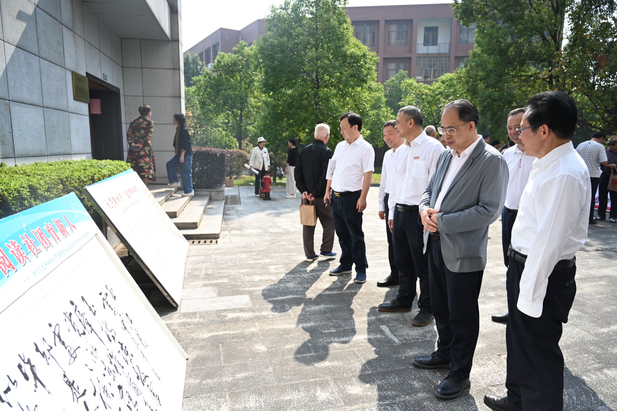 会后,何振一行来到学校图书馆东门外,参观了 “迎评估 颂城院”老干部优秀诗词书画作品展。