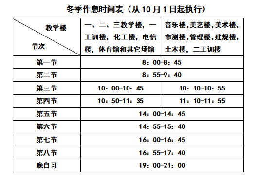 (三)从10月1日起,学校执行冬季作息时间(见附件)。